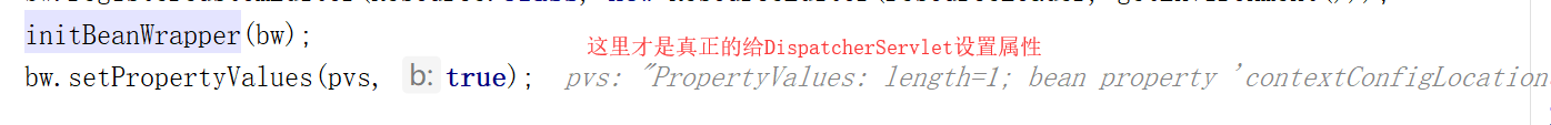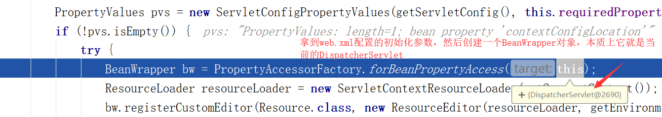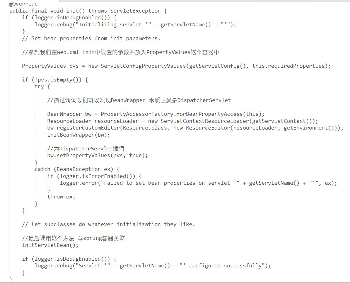 2)调用HttpServletBean 的init方法,拿到初始化参数为DispatcherServlet赋值,并调用FrameworkServlet的 initServletBean()方法