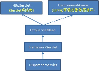 最上面的抽象类HttpServletBean派生自HttpServlet,说明它是一个servlet类,另外它还实现了spring的EnvironmentAware接口,说明它具备获取一个环境对象的能力。HttpServletBean本身有个成员变量environment,它的默认值是StandardServletEnvironment对象,既然都已拥有了环境对象为什么还要实现这个接口呢?目的应该是让用户有扩展的机会,比如用户可以编写一个StandardServletEnvironment的派生类,然后把这个类赋值HttpServletBean。对于spring环境对象没概念的朋友,可以看下这篇博客《Spring3.1.0实现原理分析(三).配置数据》。