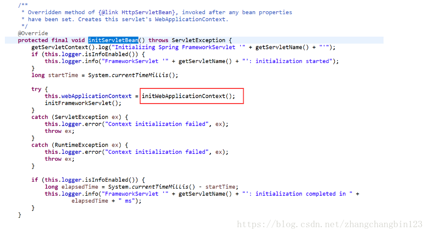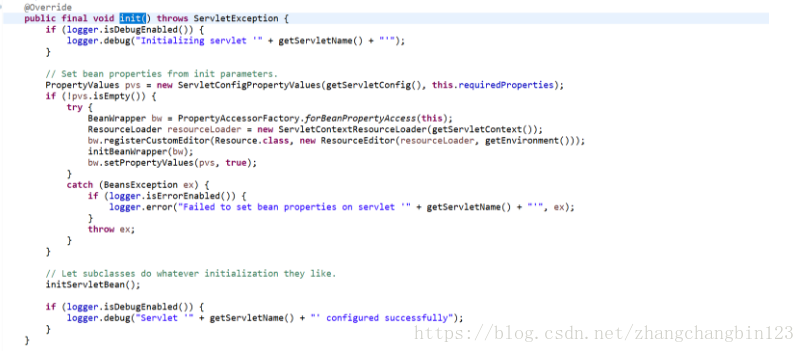 在springmvc中真正实现逻辑的是在DisPatcherServlet中进行的,DisPatcherServlet是实现servlet接口的实现类,init()方法在其父类HttpServletBean中