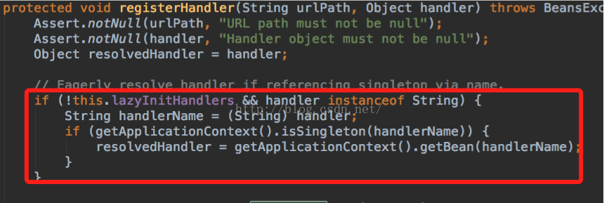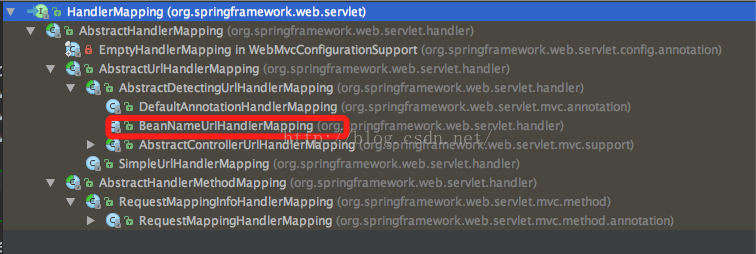 这是一个接口,该接口表示实现了这个接口的类是完成url和处理bean映射逻辑的。当SpringMvc启动就会根据选择的实现类去把Controller类型的bean和url绑定如果我们不在配置文件配置,在BeanNameUrlHandlerMapping 这个实现类去完成这个工作(实现类种类如图1)时。在registerHandler(String urlPath, Object handler)这个方法中把urlPath当做bean的Name,从ApplicationContext中拿到bean的实例,然后放入urlPath为key,value为该实例的map中(图2)。