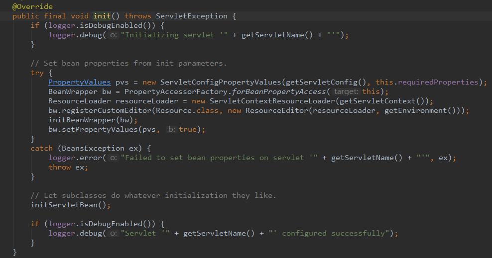 - 第一步。初始化serlvet,即调用HttpServletBean的init()方法。该方法中会获取servlet的初始化参数,也就是我们在web.xml中配置的<init-param>这个标签的属性和值。对bean的属性进行配置。如图
