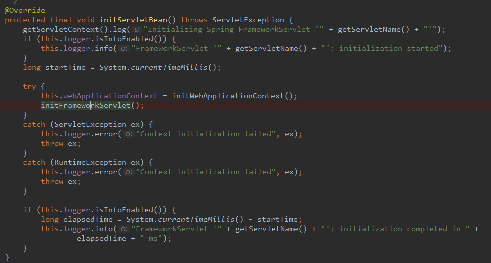 - 执行上图的initServletBean()方法。 该方法是由它的子类去进行具体的初始化。该方法就做了一件事。调用initWebApplicationContext()去初始化一个新的上下文。作为DispatcherServlet的上下文环境