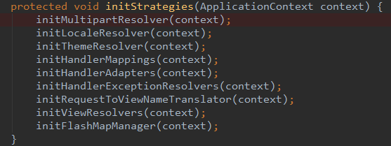 - 然后IOc创建完后,还要初始化MVC其他模块。比如支持国际化的LocaleResolver、支持HandlerMappings、以及视图生成的ViewResolvers等的初始化,如图:
