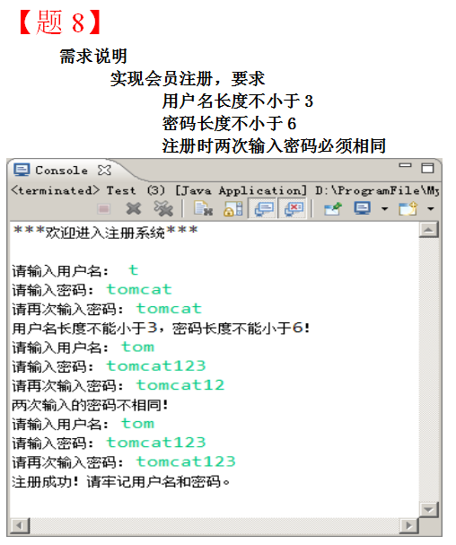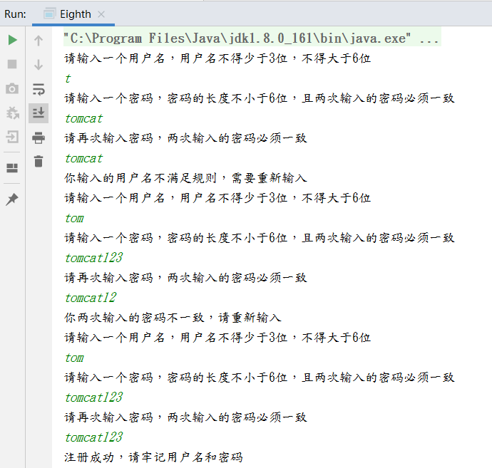 1 import java.util.Scanner; 2 3 /** 4 * @auther::9527 5 * @Description: 第八题 6 * @program: 多线程 7 * @create: 2019-08-10 09:40 8 */ 9 public class Eighth { 10 static Scanner scanner = new Scanner(System.in); 11 12 public static void main(String[] args) { 13 Eighth eighth = new Eighth(); 14 eighth.login(); 15 } 16 17 //注册用户名的方法 18 public void login() { 19 String name = ""; 20 boolean isOK = false; //设置跳出循环的标志位,判断是否可以退出循环 21 int num = 0; //设置计数器,如果密码ok,计数器+1,如果用户名OK,计数器+1,如果计数器最终取值为2,则判断标志位OK 22 String passWords = ""; 23 24 do { 25 System.out.println("请输入一个用户名,用户名不得少于3位,不得大于6位"); 26 String receive = scanner.next(); 27 System.out.println("请输入一个密码,密码的长度不小于6位,且两次输入的密码必须一致"); 28 String receive1 = scanner.next(); 29 System.out.println("请再次输入密码,两次输入的密码必须一致"); 30 String receive2 = scanner.next(); 31 //按题目要求判断帐号位数,满足条件 32 if (receive.length() >= 3) { 33 //用户名符合条件,计数器+1 34 name = receive; 35 num += 1; 36 } else { 37 //如果用户名长度不符合要求,计数器清零 38 num = 0; 39 System.out.println("你输入的用户名不满足规则,需要重新输入"); 40 } 41 if (receive1.length() >= 6) { 42 if (receive1.equals(receive2)) { 43 passWords = receive1; 44 //密码符合条件,计数器+1 45 num += 1; 46 } else { 47 //如果两次输入的密码不一致,计数器清零 48 System.out.println("你两次输入的密码不一致,请重新输入"); 49 num = 0; 50 } 51 } else { 52 //如果密码不满足6位,计数器清零 53 num = 0; 54 System.out.println("你的密码长度不满6位,需要重新输入"); 55 } 56 if (num == 2) { 57 isOK = true; 58 } 59 } while (!isOK); 60 System.out.println("注册成功,请牢记用户名和密码"); 61 } 62 }