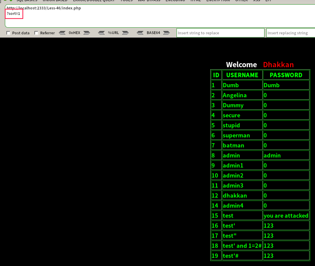 http://localhost:2333/Less-46/index.php?sort=(select 2)