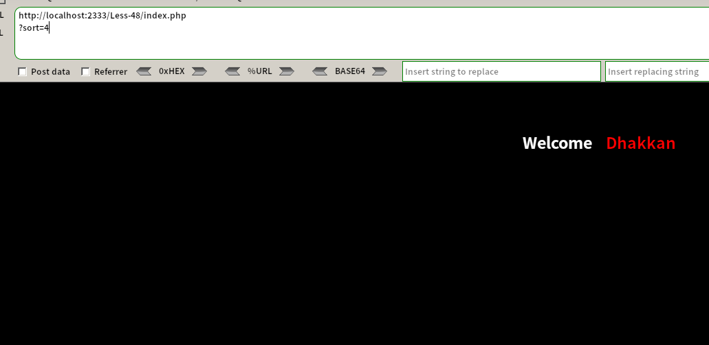 http://localhost:2333/Less-48/index.php?sort=1 and sleep(if((1=1),0,1))