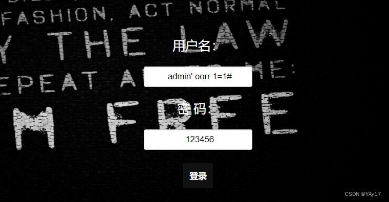 尝试万能密码。payload:admin' or 1=1# 密码随便输入,即可实现了登录。
