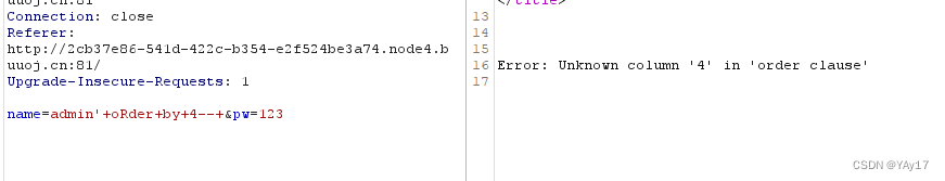 判断字段数,oorrder bbyy 4#报错,3的时候正常回显。(by关键字被过滤)