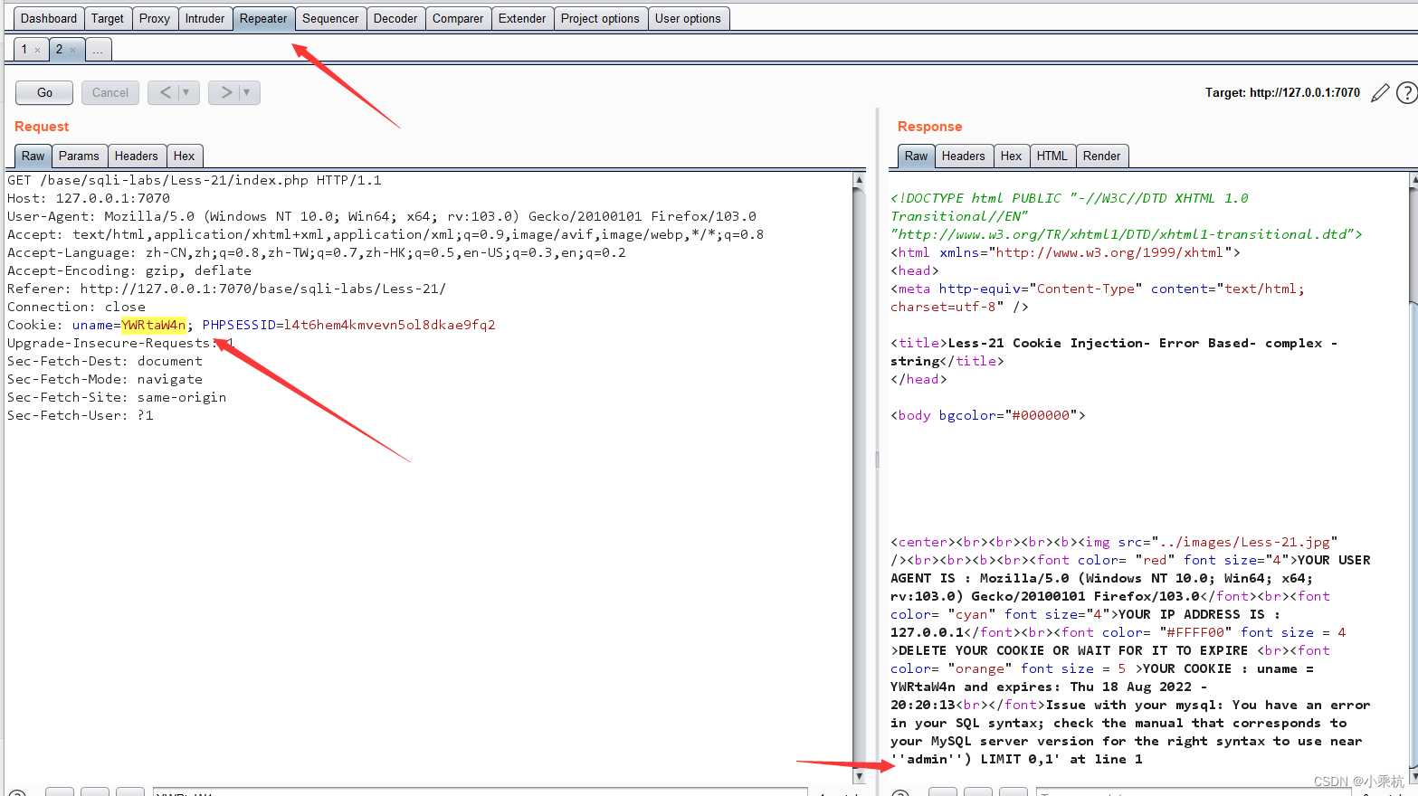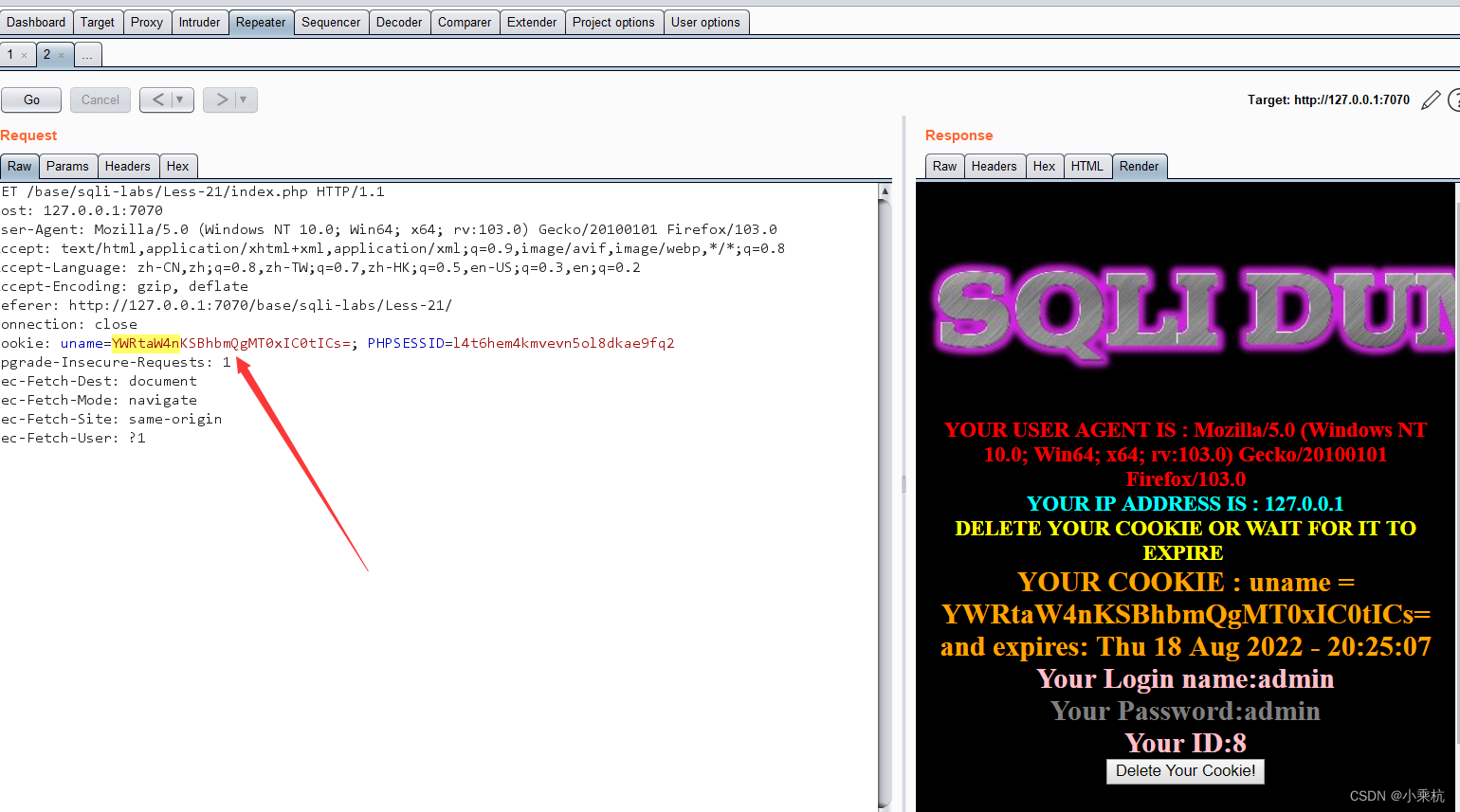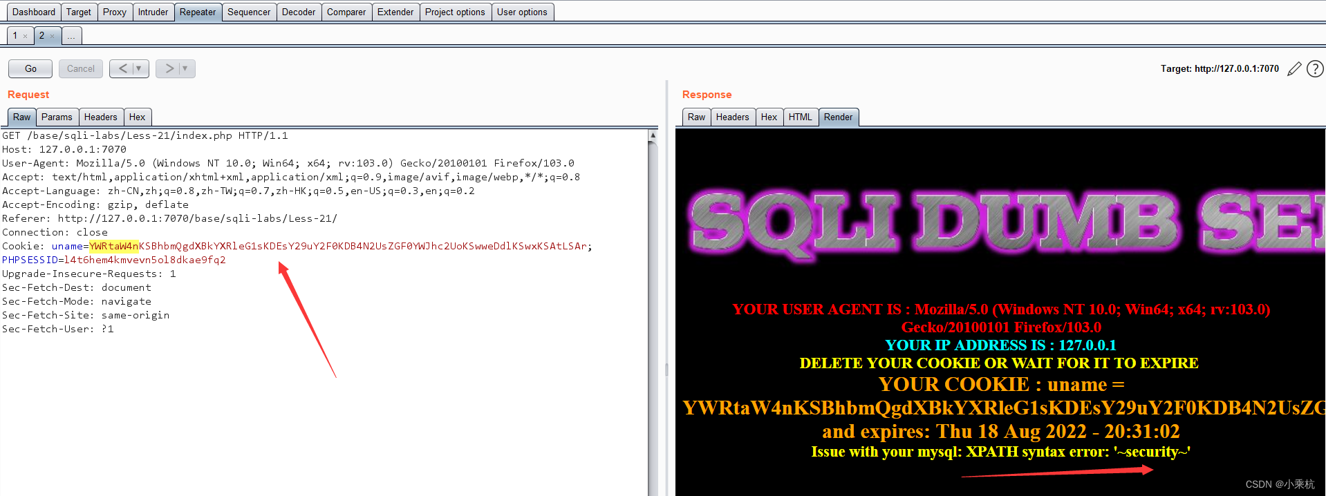 以上就是诚心帽子最近收集整理的关于sqli-labs/less-21;header头注入;burpsuite抓包;mysql注入;的全部内容,更多相关sqli-labs/less-21内容请搜索靠谱客的其他文章。