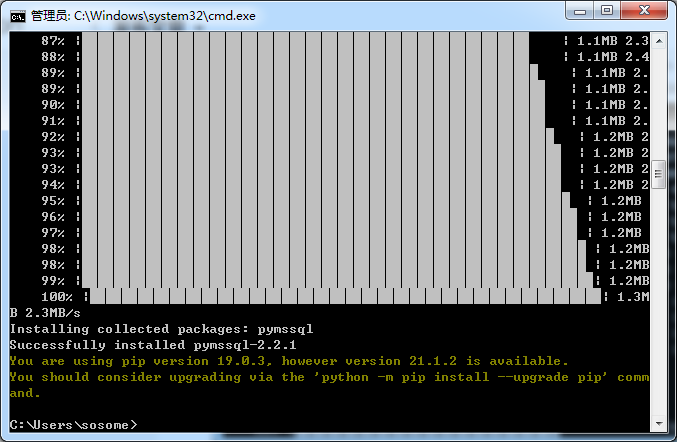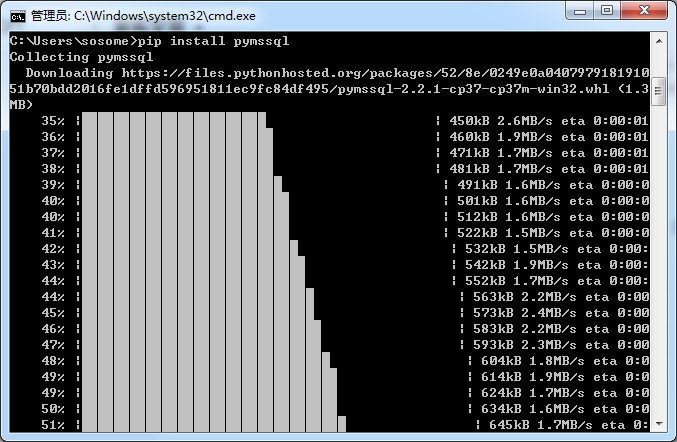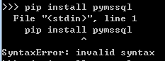 嗯。。。。居然提示没有pymssql这个包,百度下,说是 pip install pymssql就好,很简单嘛,结果进入到python会话窗口中一打这个命令。。。报错?