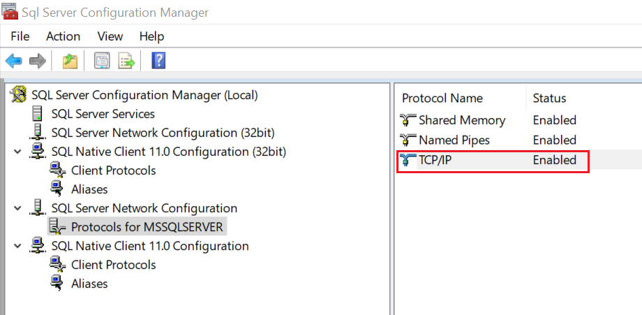 2.检查Sql Server配置管理工具的配置中,TCP/IP是否为禁用状态。(SQL Native Client 11.0 Configuration和SQL Server Network Configuration都检查下)