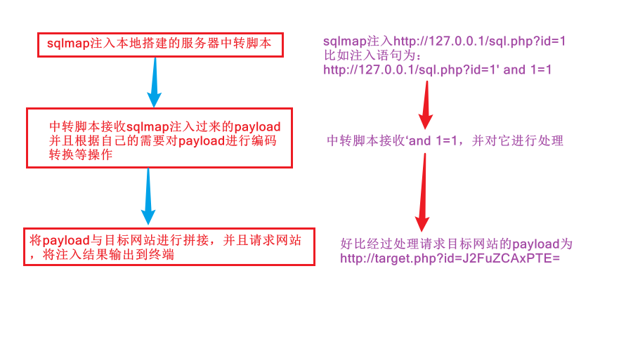 首先我们我们来分析一下sqlmap中转注入的原理,如下图: