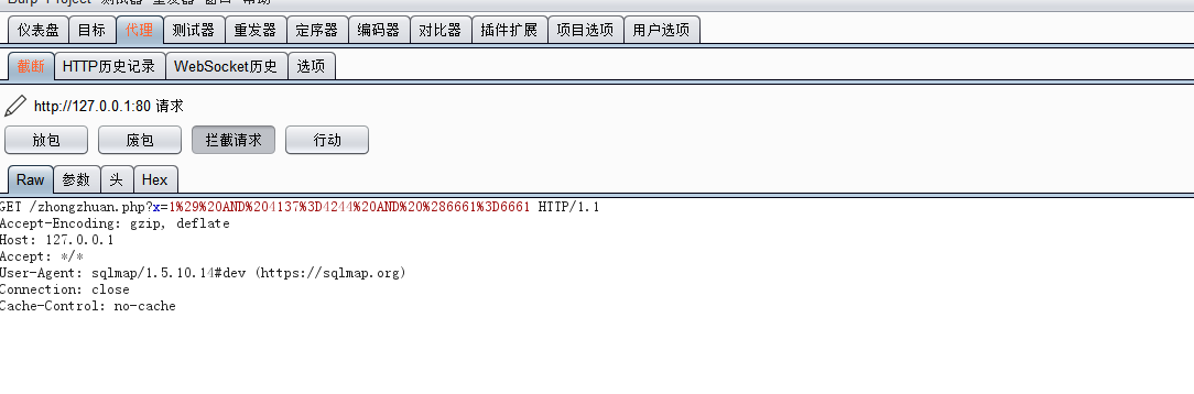 python2 sqlmap.py -u "http://127.0.0.1/zhongzhuan.php?x=1" -v 3 --proxy=http://127.0.0.1:8080