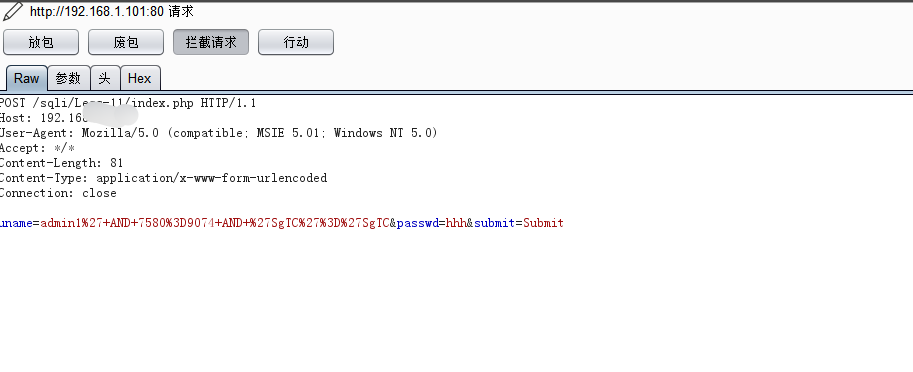 在注入天书中有post型注入,随便选了一个11关卡,抓取less-11关的包,注入点在登录框这里。