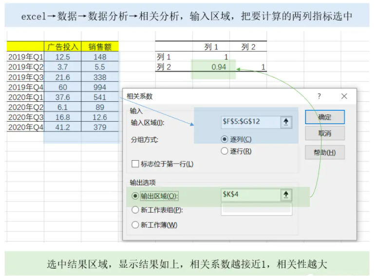 计算出可以发现,广告投入与销售两个指标之间,确有相关关系。至于具体是怎么相关的,可以再做进一步研究。间接相关关系,经常用来找改进业绩的措施。比如互联网行业里著名的“魔法数字”法,本质就是找用户浏览、点赞、分享、登录等行为,与用户留存、付费行为之间的相关关系。