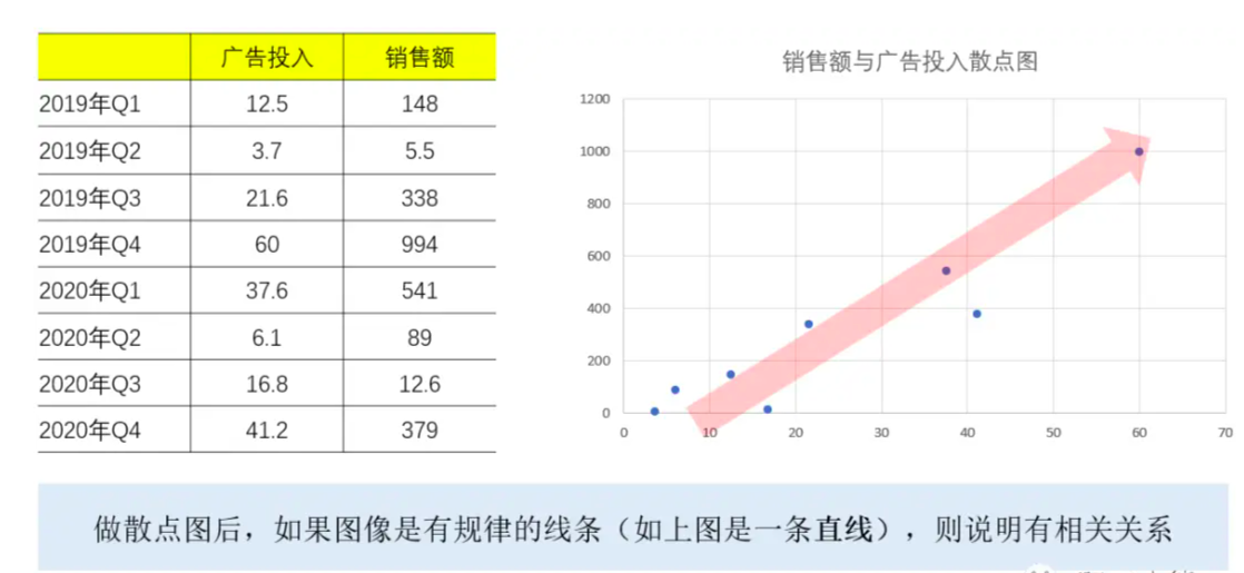 有些并非直接相关,但理论上有关系。比如品牌广告与销售收入,理论上肯定是有关系的。但是品牌广告又没有带货链接,不能直接说:有5000万的销售业绩是用户通过广告链接购买的。此时就是典型的间接相关关系。分析间接相关关系,有2种常用方法,一种是散点图法,另一种是计算相关系数。