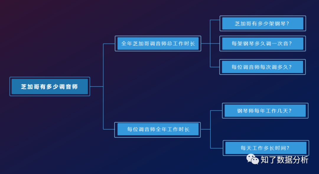 费米首先将这个大问题拆解成了两个小问题:每年芝加哥全部调音师的总工作时长,每位调音师每年的工作时间。