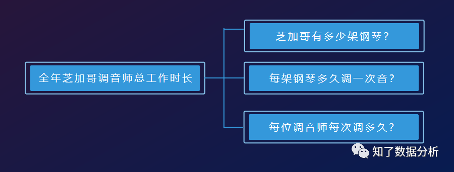 然后我们接下来再看,每年芝加哥全部调音师的总工作时长是多少?费米继续对这个问题进行了拆解,拆解成了3个小问题。