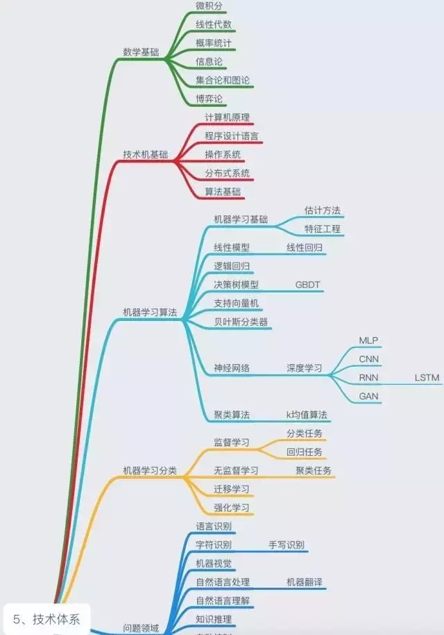 正则表达式、图搜索、启发式搜索、最小二乘、模拟退火、命题逻辑、一阶逻辑、自然演绎、自动机、形式文法、特征工程、分布式学习、增量学习、动态规划、约束规划、逻辑程序、Prolog、Lisp/Scheme/Clojure,对话系统,高斯分布,贝叶斯网络,自动规划,线性回归,局域回归,生成模型,辨别模型,朴素贝叶斯,逻辑回归,BP网络,核方法,矩阵分解,主分量分析PCA,支持向量机SVM,马尔科夫随机场MRF,框架问题,决策树,随机森林,感知机,KNN学习,语音模型,分词,实体识别,关系提取,句法分析,语义分析,篇章分析,情感分析,文本摘要,TFIDF,LDA,卷积滤波