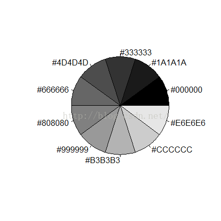 > pie(rep(1, n), labels=mygrays, col=mygrays)