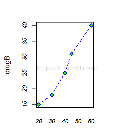 plot(dose, drugB, type="b", pch=23, lty=6, col="blue", bg="green")