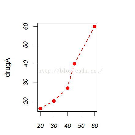plot(dose, drugA, type="b", pch=19, lty=2, col="red")